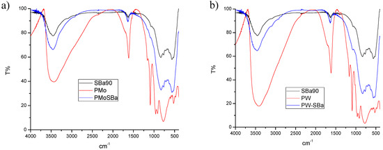 IR spectra of the Preyssler acid (PW) show an asymmetric stretching vibration of the terminal oxygen at 970 cm−1 and the P–O asymmetric stretching frequency at 1090 and 1163 cm−1. In PWMo, the asymmetric stretching vibration for the terminal oxygen shifts to 1088, and the P–O stretching is observed at 958 cm−1. The vibration at 1163 cm−1 is weak due to the change of symmetry in the structure by the Mo atom. Both bulk catalysts have vibrations at 940–913 cm−1 for W–O–W stretching, at 772–777 cm−1 for W=O stretching, and at 525 cm−1 for P–O bending [23,25,30] (Figure 1). When these active phases are supported on Catalox SBa-90, the main bands remain but shift to lower wavenumbers probably because of the acid–base interaction with the alumina surface.