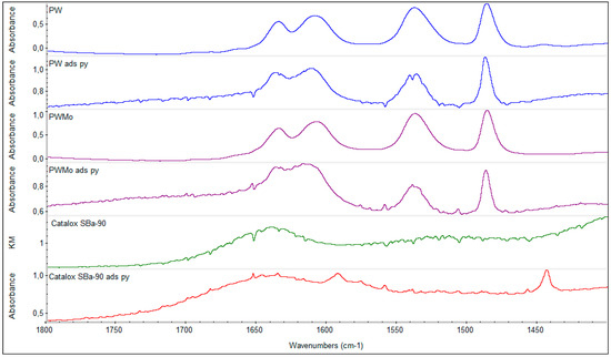 FT-IR spectra of pyridine adsorption (ads py) on PW, PWMo, and Catalox SBa-90.