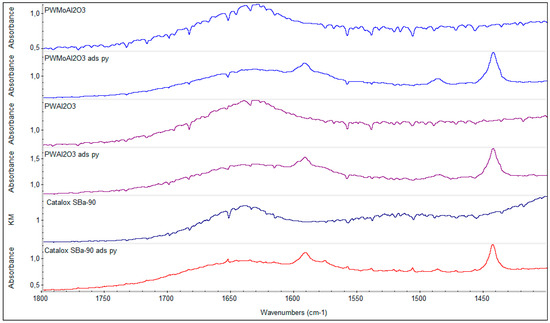 FT-IR spectra of pyridine adsorption on Catalox-SBa90, PWAl2O3, and PWMoAl2O3.
