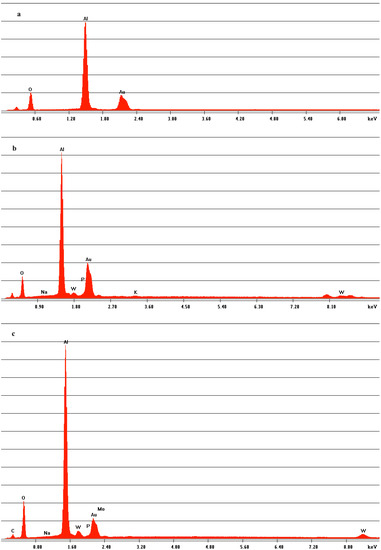 To verify that the heteropolyacid was supported on the alumina surface, we recorded the EDX spectra of the active phase (Figure 4) support and both catalysts (Figure 5); in the spectrum of the support, a clear Al peak appeared (a). In the case of the PWAl2O3 catalyst, we observed Al, P, Na, and W (b). PWMoAl2O3 includes the Mo peak (c). The mapping of the catalyst shows the high dispersion of the active phase on the alumina surface for both catalysts (Figure 6 and Figure 7).
