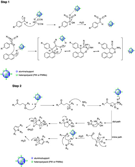 Preyssler heteropolyacids have been used mainly as acid catalysts in the synthesis of esters [24], tetrazines [25], ethers [26], pyrimidinones [27], pyranopyrazoles [28], etc. In this case, the polyoxometalate is supported on fibers such as cellulose acetate or chitosan to obtain composites [29,30,31]. Other heteropolyacids have also been supported on different matrices, such as silica gel [32,33], carbon [34], and clays [35], and the supported catalysts that are obtained have been used in different reactions, all of them acid catalysis reactions, such as those for obtaining the pyrrole core in tricomponent reactions [36], the Clauson–Kaas reaction [37], and from condensation [38]; in all of these processes, the yields are high, the supported catalyst is usually more active than the active bulk active phase, and the catalyst recovery favors several cycles of use. However, reports of heteropolyacids supported on alumina are scarce [26,39] due to the acid–base reaction that can occur on the surface of this type of support because of the basic behavior of their surface [40,41]. In this work, an attempt was made to develop a bifunctional heteropolyacid–alumina catalyst with the aim of using it both in the synthesis of a series of pyrroles derived from amines and in the synthesis of aminochromenes that were functionalized with the pyrrole core.