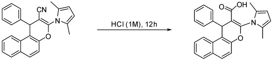 The unstable crude product obtained in Section 3.4.4 was hydrolyzed in the presence of 1 M HCl (20 mL) under reflux for 12 h to obtain the chromene–pyrrole carboxylic acid derivative as the major reaction product (Scheme 3) The product was purified by column chromatography (petroleum ether/ethyl acetate mixtures) and recrystallized from ethanol to give one stable product that was characterized by 1H-NMR, 13C NMR, and FT-IR.