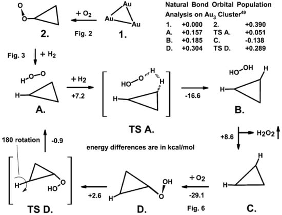 Using DFT calculations, Thomson et al. explored propylene epoxidation over a neutral Au3 cluster in the presence of H2 and O2 [119]. A side-on O2 adsorption on Au3 is followed by dissociative addition of H2 to generate an OOH species and a lone H located on the gold trimer. The more electrophilic O atom (proximal to the Au) of the Au–OOH group attacks the C=C of an approaching propylene to generate PO (Figure 7, ΔEact = 19.6 kcal/mol). The residual OH reacts with H to form water. The propylene epoxidation step is identified to be the rate-determining step (RDS).