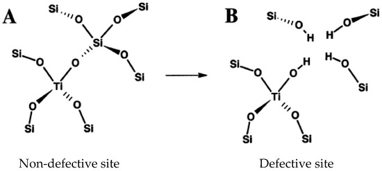 Schematic view of (A) a fully tetrahedral Ti site bonded with four O–Si groups, and (B) the same Ti site located near a silicon vacancy forming a silanol nest [32]. Copyright © 2004 American Chemical Society.