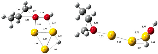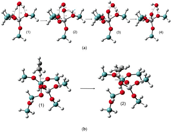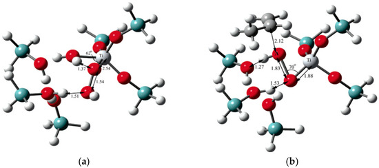 The last two mechanisms involve defect sites, based on a partial silanol nest model and a full silanol nest model, respectively. As Figure 2 shows, a Ti site with one defect neighbor means a total of three neighboring hydroxyl groups (or silanol groups, Si–OH). In the partial silanol nest model, only one Si–OH group is modeled instead of three, and the epoxidation mechanism mentioned above is studied, with the transition-state geometry shown in Figure 3 [32]. In the full silanol nest model, the formation of a hydroperoxy intermediate (Ti–OOH) overcomes an activation barrier of 8.9 kcal/mol (Gibbs free energy at 298 K), with the transition-state structure shown in Figure 5a. Once the generated H2O is removed from the active site, propylene can adsorb and react with the active Ti–OOH species. The activation energy for the transition-state structure (Figure 5b) is only 4.6 kcal/mol (Gibbs free energy at 298 K). In comparison to a partial silanol nest model, the Ti/defect site pathway with a full silanol nest is energetically more favorable with regard to the propylene epoxidation in the H2O2/TS-1 or H2/O2/Au/TS-1 catalytic systems.