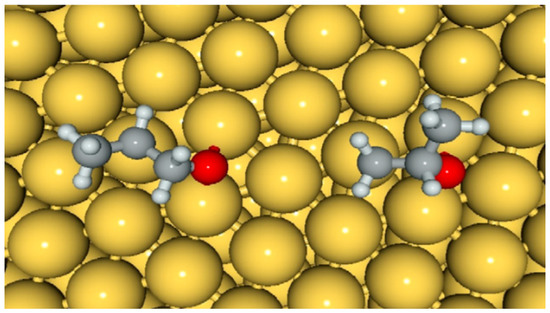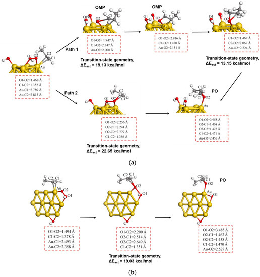 Roldan et al. investigated the partial oxidation of propylene using atomic oxygen adsorbed on Au(111) by means of DFT calculations, and they observed different intermediates with respect to different reaction pathways [120]. Surface atomic oxygen acts as a Brönsted base, stripping the allylic hydrogen (acidic hydrogen) of propylene to yield allyl and OH radicals. On the other hand, oxygen works as a Lewis acid, receiving electronic density from the C=C bond of propylene to lead to the formation of an oxametallacycle intermediate OMMP (oxygen-metal-metal-propylene, a five-member ring) incorporating two Au atoms. The OMMP can either be OMMP1 in which atomic O is bound to the end C of the C=C and the middle C of propylene is linked to the Au surface, or OMMP2 in which the atomic O is bound to the middle C of propylene and the end C of C=C is linked to gold surface, as demonstrated in Figure 8. Both OMMP1 and OMMP2 can evolve to the final product PO, and OMMP1 is also able to evolve to propanal. However, results show that the formation of OMMP on this extended surface is thermodynamically favored but kinetically inhibited (ΔEact = 14.07 kcal/mol). In contrast, the abstraction of the allylic hydrogen leading to an allyl radical is much more kinetically favored (ΔEact = 6.23 kcal/mol).