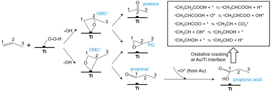 At a larger modeling scale, Turner’s group used kinetic Monte Carlo (KMC) simulations to investigate propylene epoxidation over an Au/TiO2/SiO2 catalyst. In their model, H2O2 is first generated from coadsorbed H2 and O2 on Au nanoparticles, and H2O2 can then either degrade into water or diffuse to TiO2 sites supported on SiO2 to epoxidize propylene molecules [139]. The PO formation rates predicted by KMC simulations are consistent with experimental reports corresponding to different temperatures and feed concentrations of O2 [140]. In their later kinetic modeling studies [141], several key side reactions encountered during PO formation are taken into account (acrolein formation, propanal and acetone formation from OMP isomerization, oxidative cracking into CO2, etc.), affecting the overall PO selectivity. According to Figure 10, it is the OOH species formed on Au nanoparticles that directly transfers to the neighboring Ti sites (interfacial Ti sites at the dual Au/Ti sites) to form active Ti–OOH species and epoxidize propylene to form an oxametallacycle OMP (OMC’ or OMC”, depending on which carbon of propylene is connected with O). Their KMC simulations closely reproduce the experimental findings [140]. For instance, it was found that the O2 feed concentration has a slight effect on PO selectivity (since O2 adsorption on Au particles is very weak), which is in good agreement with the kinetic tests of Taylor and Chen [142,143]. At the same time, both KMC simulations and experiments demonstrate that PO selectivity increases along with decreasing reaction temperature and increasing H2/C3H6 feed concentration ratio, since low temperature and high H2 feed concentration can help suppress side reactions that contribute to acrolein, propanal, acetone, CO2, and ethanal. It seems that the synergy of the Au/Ti dual interface sites plays a central role in the reaction network of propylene epoxidation.