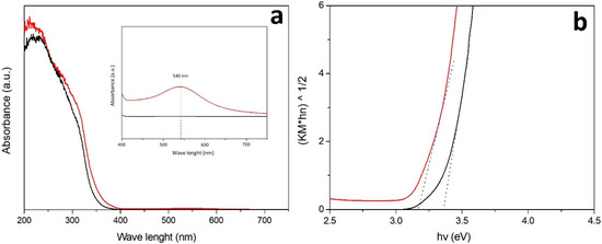 DR UV-Vis spectra (a) and corresponding Tauc plots (b) of P25 (black curve) and promoted with Au (0.2 wt%; red curve).