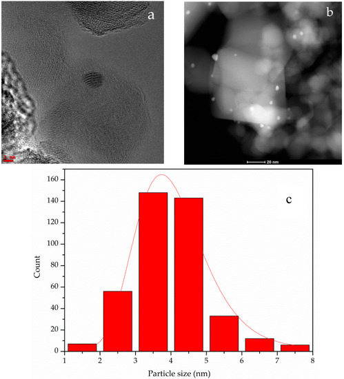 Au particle size distribution was determined from HRTEM and STEM images. Representative images are reported for 0.2 wt% Au-P25 with the respective histogram in Figure 4, revealing very small particles with a fairly narrow size distribution. Mean Au particle size was 3.6 nm.