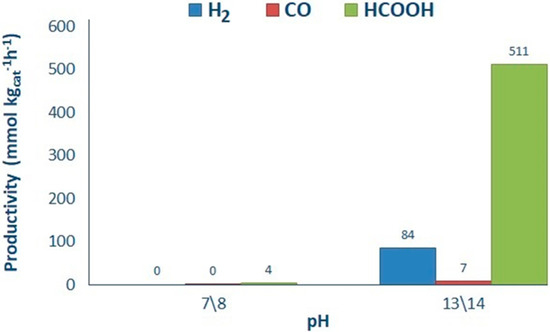 The productivity and selectivity of products on P25 has been studied at pH 7.5 and 14 in the presence of 1.66 g L−1 HS (Figure 5). The productivity of the main products, HCOOH and H2, increased in basic pH in fair agreement with previous observations [26,37]. Increasing the pH improves the CO2 solubility by forming CO3− or HCO3−, which further reduced to HCOOH or HCHO in a series of subsequent reactions (Scheme 2). Furthermore, the formed liquid products may evolve to gas phase products (H2 and CO) due to the consecutive step of photo-reforming (Scheme 2) [26,37]. According to Ao et al. [38] in studies at basic pH, the back-oxidation of HCHO to HCOOH is more likely.