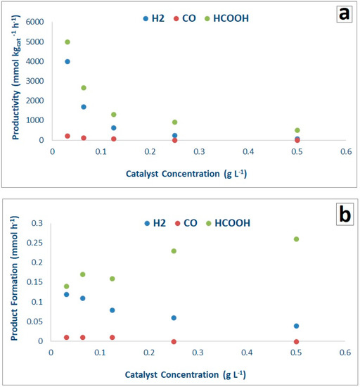 Optimization of catalyst amount has been performed halving progressively the catalyst concentration (0.5, 0.25, 0.125, 0.064 and 0.031 g L−1) in the photoreactor by using the bare P25 catalyst. According to Figure 6, lower catalyst concentration increased productivity mainly due to better light distribution through the whole reactor. The productivity of the gas phase products (H2 and CO) and of HCOOH, either normalized per mass of catalyst (Figure 6a) or not (Figure 6b) allowed to assess the best catalyst concentration in the slurry. 0.031 g L−1 of P25 returned the highest amounts of H2 and HCOOH (Figure 6) per mass of catalyst. All the productivities decreased when increasing catalyst mass, as quite obvious due to the normalization on catalyst mass itself. When looking at the data without normalising against catalyst mass, the highest yield in HCOOH was obtained with the highest catalyst amount and progressively decreased with decreasing catalyst concentration. In a symmetric way, hydrogen and CO yields decreased progressively with increasing catalyst concentration (Figure 6b). Therefore, this parameter can be chosen to tune the process towards the maximisation of liquid or gas phase products, depending on process goals.