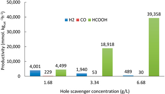 Effect of HS concentration on productivity. Reaction time: 24 h. P25 as a photocatalyst (0.031 g L−1) and at pH = 13/14.