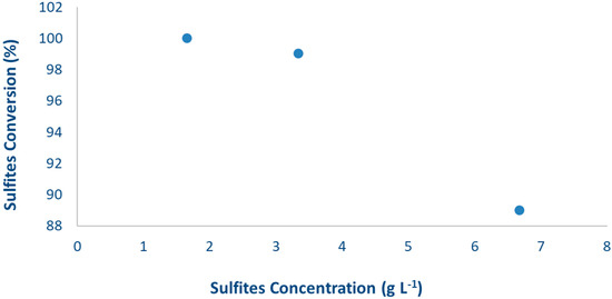 Sulphite conversion vs. their initial concentration after 24 h of reaction. P25 as a photocatalyst with 0.031 g·L−1 loading and at pH = 13/14.