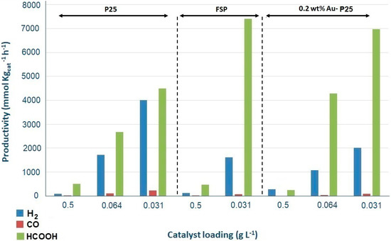 Metals addition is a common strategy to improve visible light harvesting and to enhance the separation of photogenerated charges. We have investigated the performance of gold nanoparticles on the productivity and selectivity of products. 0.2 wt% Au loading was selected based on previous screening [37]. Au-P25 has been tested maintaining a fixed value of HS 1.66 g L−1, basic conditions (pH 13/14) and, also in this case, variable catalyst amount. Figure 10 reports the overall comparison of productivity of all the tested photocatalysts.