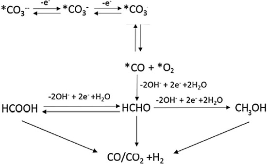 Consecutive pathways for CO2 photoreduction and photoreforming occurring at basic pH [37].