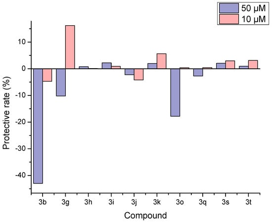The ability to prevent SH-SY5Y cells from MPP+-induced damage is shown in Table 4 and Figure 1. Unfortunately, our results indicated that the protective capcities of compounds (3b, 3g, 3h, 3i, 3j, 3k, 3o, 3q, 3s, 3t) under 10 and 50 μM were low. We chose these compounds for the aforementioned experiment based on the fact that they did not show appreciable neurotoxicities on SH-SY5Y cells under 50 μM. (The inhibition rates of 20 compounds are illustrated in the supplementary materials).