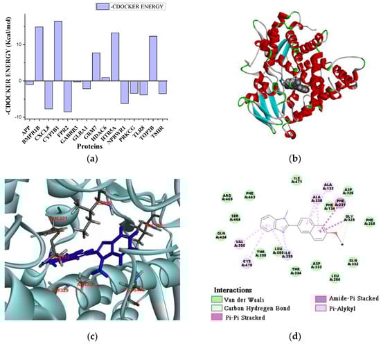 Molecular docking simulations. (a) CDOCKER ENERGY of potential targets; (b) Molecular docking of compound 3g into CYP1B1 protein; (c) Three-dimensional representation of the complex (CYP1B1 protein and 3g compound); (d) Two-dimensional interactions diagram of the complex.
