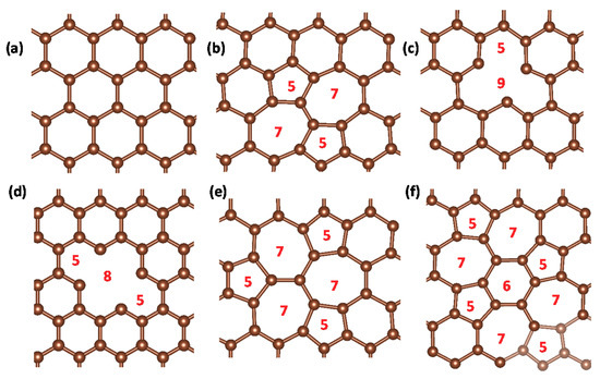 Geometric structure of pristine and defected graphene. (a) Pristine, (b) SW (55-77), (c) D1 (5-9), (d) D2_I (5-8-5), (e) D2_II (555-777) and (f) D2_III (5555-6-7777).