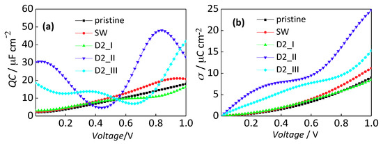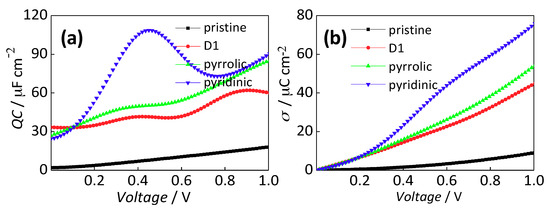 The QC and ESCD of the three kinds of graphene are shown in Figure 6. Compared to the pristine graphene, they all deliver much higher QC. Graphene with pyrrolic and pyridinic N even peakes at 108.6 μF/cm2 (0.45 V) and 84.8 μF/cm2 (1.0 V), respectively. As shown in Figure 6b, when the voltage reaches 1.0 V, the ESCD of the D1 defected graphene and graphene with pyridinic and pyrrolic N are 44.6, 53.8, 75.5 μC/cm2, respectively, higher than that of the pristine graphene (9.0 μC/cm2). Therefore, the presence of unbonded atoms can contribute markedly to the energy storage ability. Considering that Celectrolyte is typically around 20 μF/cm2 [15], Cgraphene no longer limits Ctot, and it is the Celectrolyte that dominates Ctot.