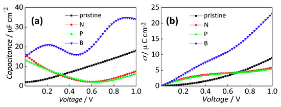 Here, N, P and B are introduced to replace the carbon atom in pristine graphene and the QC behavior is investigated. As shown in Figure 4, there is an obvious difference in the QC of doped graphene. When the voltage is low (for example, below 0.3 V), the QC of all three kinds of doped graphene is higher than that of the pristine graphene. However, when the voltage increases, the N and P-doped graphene show lower QC compared to the B-doped and pristine graphene. The QC of B-doped graphene is the highest. Since N and P are n-type donators, the Fermi level of the system positively shift, while the whole DOS profile is similar to that of pristine graphene. Therefore, the QC profile of N- and P-doped graphene is the nearly same as that of pristine graphene in shape, but with a positively shifted minimum. The ESCD also follow a similar pattern. When the voltage is below 0.7 V, all three doped graphenes show a higher ESCD. However, when the voltage is above 0.7 V, the N- and P-doped graphene show worse performance (less than 6 μC/cm2) compared to pristine graphene (9.0 μC/cm2), while B-doped graphene can have an ESCD over 23 μC/cm2. Therefore, B-doped graphene is a very good candidate for a LIC cathode, while the N- and P-doped graphene can only be used under low voltage conditions (below 0.3 V).