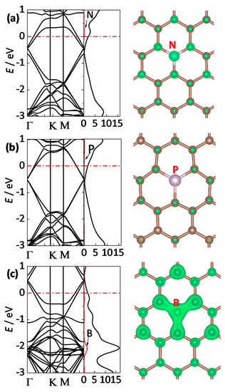 From the BDCD shown in Figure 5, it can be seen that the band with a high pz character contributes to the QC of these three kinds of doped graphene, which follow the case of defected graphene. For the N- and B-doped graphene, this is the state caused by the alien atom and the carbon atoms connecting to the alien atom and their equivalent in the same sublattice. However, the P atom seldom has an effect on the voltage range of LIC. The split DOS of the N, P and B atom in doped graphene shown in Figure S3 also supports this result.