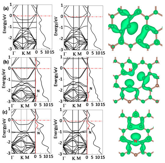 Band structure, density of states (DOS) and band-decomposed charge density (BDCD) iso-surface of (a) N-doped graphene (0.003 e/Bohr3); (b) P-doped graphene (0.003 e/Bohr3) and (c) B-doped graphene (0.006 e/Bohr3).