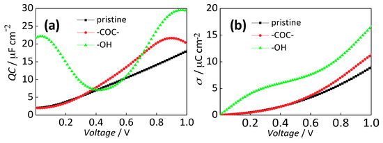 Oxygen is usually found in GO fabricated by the modified Hummer’s method. After heat treatment or chemical reduction, most of the O will be removed, but there are still many residual O-containing functional groups, such as bridged oxygen (–COC–) and hydroxyl (–OH) and carbonyl (C=O) [42]. We focus on the groups located on the basal plane of rGO in this work. Therefore, C=O, which is mostly found at the edge of rGO, was not considered and only bridged oxygen (–COC–) and hydroxyl (–OH) are investigated. The QC and ESCD of rGO with –COC– and –OH are shown in Figure 8. The QC of the two types of rGO are higher than that of pristine graphene in this figure. Therefore, the presence of both types of O have a positive effect on the energy storage ability, although the O in –COC– has a very limited effect. The QC of rGO with –OH fluctuates with increasing voltage and peaks at 29.5 μF/cm2, while the capacitance peak of rGO with –COC– is 21.6 μF/cm2. The ESCD of two kinds of rGO are 11.3 μC/cm2 and 16.6 μC/cm2, respectively. Therefore, the energy storage ability of rGO with residual O atoms is similar to that of graphene with D2_III, which is still lower than D2_II defected graphene and graphene with B and unbonded atoms.