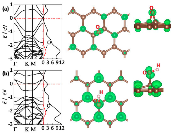 Band structure, density of states (DOS) and band-decomposed charge density (BDCD) iso-surfaces (0.006e/Bohr3) of (a) graphene with –COC–; (b) graphene with –OH.
