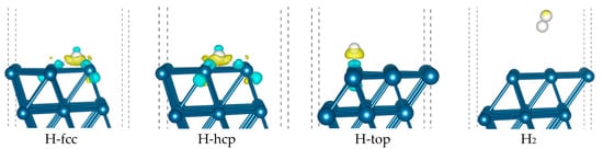 To explore the electronic interactions of H(a) and H2 with Pt(111), charge density differences (CDD) are calculated and shown in Figure 2. It is defined as: Δρ = ρadsorbate/slab − ρslab − ρadsorbate, where ρadsorbate/slab is the charge density for the adsorbed system; ρslab and ρadsorbate are the charge densities for the non-interacting slab substrate and adsorbate, respectively. The yellow and grey–blue parts represent the accumulation and depletion electrons, respectively.