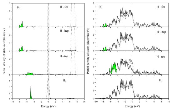 As shown in the partial density of states (PDOS) of H(a) in Figure 3a, the s peaks of H(a) broaden and shift to −8~−6 eV for H-fcc and H-hcp configurations and −6~−4 eV for H-top in comparison with the free radical H atom. Meanwhile, there are the corresponding electronic peaks of Pt at the same energy position, as shown in the green peaks of Figure 3b. This indicates the strong interactions between H(a) and Pt(111). However, the PDOS peak shape of H2 on Pt(111) remains unchanged, and the corresponding peaks of Pt are almost the same as those of the non-interacting substrate. Therefore, the very weak interactions between H2 and Pt(111) occur.