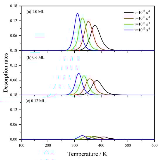 As shown in Figure 4, one symmetric desorption peak is observed in the H2 TDS spectra at the low (0.12 ML), medium (0.6 ML) and high (1.0 ML) coverages, respectively. The peaks shift to the low temperature with the increase of pre-exponential factor (v). Since the pre-exponential factor represents the collision frequency of reactants upon reaction, the higher v leads to the more possibility of H(a) desorption at the same temperature. Therefore, the peak of H2 TDS shifts downwards with the pre-exponential factor. Meanwhile, the peaks become higher and narrower than those of v = 1012 s−1.