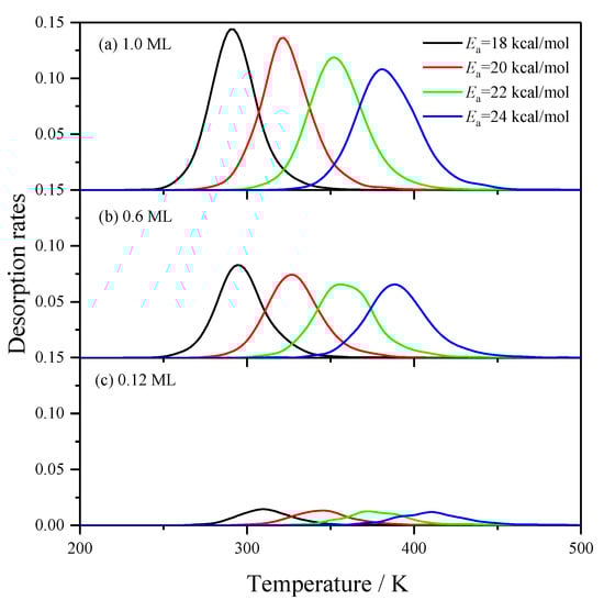 Similar results are observed for the H2 TDS spectra on Pt(111) with the decrease of activation energy for H(a) desorption (Ea). That is, only one desorption peak is observed in Figure 5, and it shifts downwards with the decrease of Ea. Because the H(a) desorption rates increase with the low desorption barrier at the same temperature, the peak of H2 TDS spectra shifts downwards with the decrease of Ea. Similarly, the corresponding desorption peaks also become higher and narrower than those of Ea = 24 kcal/mol.