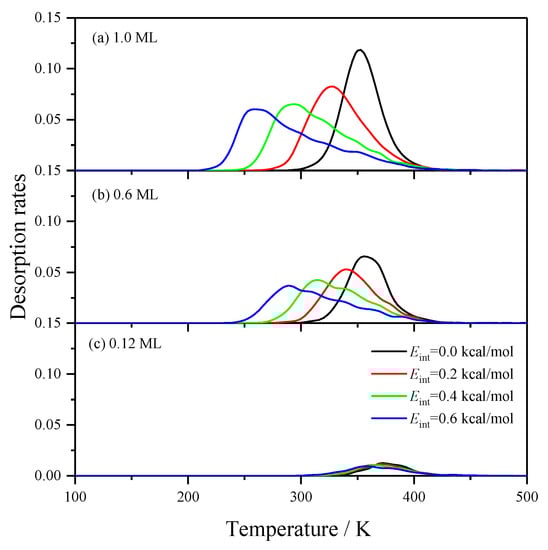 At the low coverage (0.12 ML), the H2 desorption peaks at 390 K almost remain unchanged with increasing the lateral interaction energy (Eint). This might be attributed to the large distance among H(a) species at the low coverage, which leads to the invalid lateral interaction effects on the TDS spectra. If the H(a) coverage increases to 0.6 ML, the main desorption peaks shift to 350, 320 and 290 K corresponding to the Eint of 0.2, 0.4 and 0.6 kcal/mol, respectively. Meanwhile, two peaks appear when Eint is larger than 0.2 kcal/mol. When the coverage is up to 1.0 ML, the highest desorption peaks shift to 330, 290 and 260 K with Eint, respectively. This is attributed to the strong effects of the lateral interactions, which leads to the decrease of the desorption barrier of H(a) species.