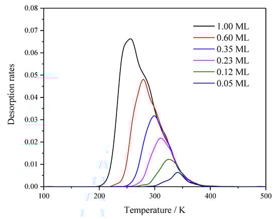 The H2 TDS spectra calculated by the kMC simulation based on DFT method at different coverages are shown in Figure 9. It can be learned from Figure 9 that the desorption peak at 0.05 ML is at 345 K, which is well consistent with the experimental value of 343 K [21]. It shifts to the low temperature with the increase of H(a) coverage. When the coverage is larger than 0.6 ML, two peaks are observed. Furthermore, the desorption peak at the low temperature shifts to 250 K when the coverage is up to 1.0 ML. This is also consistent with the experimental peak temperature at 235 K in TDS spectra [21]. The H2 TDS spectra derived from the kMC simulation based on DFT method unanimously prove that the two desorption peaks are derived from the lateral interactions among H(a) species. The simulation results are well consistent with those in experiment, indicating the method of kMC based on DFT calculation is feasible and reliable.