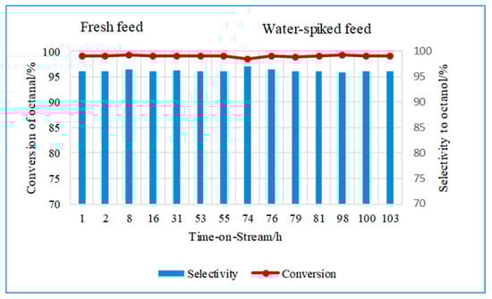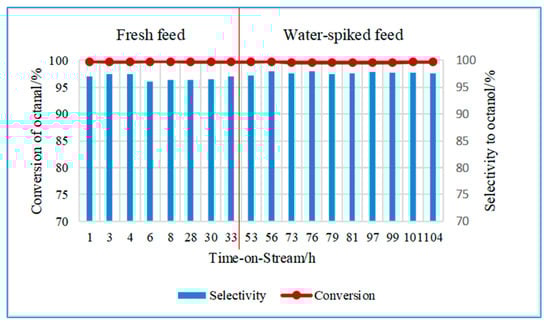Water impact studies were carried out at 160 °C and with a hydrogen-to-aldehyde ratio of 2 (H2:octanal, 2:1). These conditions were established in a previous study as the optimum for octanal conversion and octanol selectivity [25]. Once steady-state conversion was reached using the fresh feed, the water-spiked feed was introduced to the system.