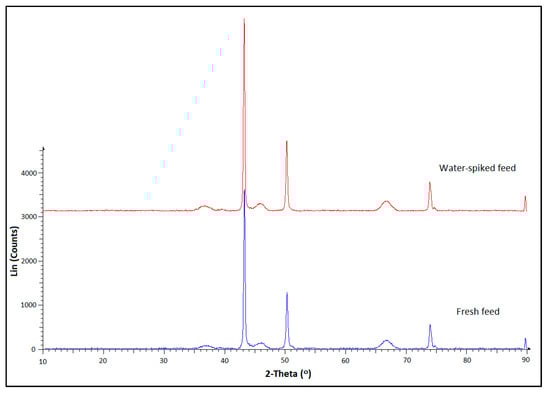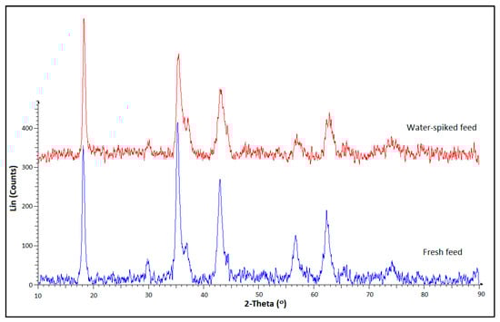 Diffractogram of the used Cu/Al2O3 after the reaction with fresh feed only and water-spiked feed.