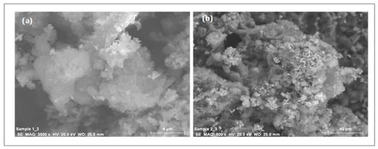 SEM image of Cu/Al2O3 after (a) the reaction with fresh feed and (b) reaction with the water-spiked feed.