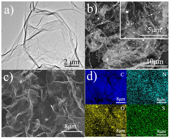 The structure and morphology of materials were investigated through scanning electron microscopy (SEM) and transmission electron microscopy (TEM) [27]. As observed in Figure 1 and Figure S1, the elements of C, N, O and S were distributed uniformly in NSG, with the fabrication of stacking graphene sheets. This specific morphology could catalyze the reaction process derived from the exposing of more active sites. The SEM analyses (Figure 1b) confirm that the heteroatoms were doped successfully. The microstructure of nitrogen doped graphene (NG) and sulfur doped graphene (SG) were shown in Figures S2 and S3 where the twisted graphene layers were clearly observed.