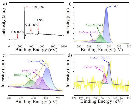 X-ray photoelectron spectroscopy (XPS) tests were the valid method to analyze the ingredients and chemical valence of materials [28]. As shown in Figure 2a, Compositions of C, N, O and S were evaluated through XPS survey spectrum whose atomic percentages respectively are 91.90, 4.18, 3.90 and 0.02 at %, demonstrating the successful doping with nitrogen and sulfur. As observed from Figure 2b, sp2 hybridized graphitic carbon, C–S and C=O and C=N were corresponding to 284.5 eV, 285.5 eV and 287.0 eV, respectively. Pyridinic N (397.8 eV), pyrrolic N (398.9 eV) and graphitic N (400.3 eV) all existed (Figure 2c). As we know, graphitic N is viewed as active sites in the oxygen reduction reaction [23,28]. Moving to Figure 2d, high resolution S 2p, the peaks of 163.9 and 165.0 eV can ascribe to the S 2p spin-orbit doublet (S 2p1/2 and S 2p3/2) [29], affected by C–S–C, deeply demonstrating the successful addition with sulfur [30]. Compared with the high resolution N 1s of NG (Figure S4), the existence of C–S–C and synergistic effects of N and S doping may be the essential factors of performance improvement for NSG. All of this demonstrated the synergy of N and S catalyzed the activity of NSG.