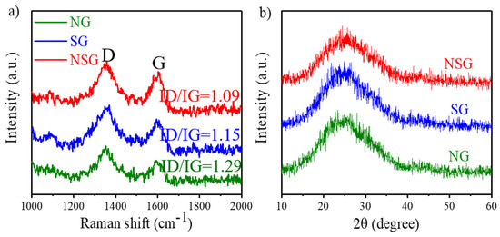 Raman spectra (a) and X-ray diffraction (XRD) (b) of NSG, NG and SG.