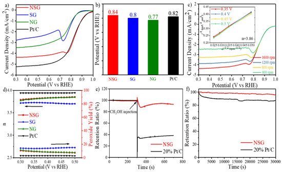 Compared with commercial Pt/C (20 wt %), the ORR performance of NSG, SG and NG was investigated via LSV in 0.1 M KOH electrolyte (Figure 4a). Obviously, NSG shows higher onset potential (0.95 V vs. RHE) compared with SG and NG (0.90 and 0.89 V). For half-wave potential, as shown in Figure 4b, the value of NSG (0.84 V) is prior to that of Pt/C, SG and NG (0.82, 0.8, 0.77 V), indicating its preponderant electrocatalytic performance for ORR. In addition, NSG displays large limited current density, demonstrating a more efficient mass transfer among such electrocatalysts [5].