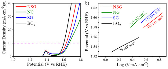 (a) OER linear sweeping voltammetrys (LSVs) of NG, SG, IrO2 and NSG at a sweep rate of 10 mV s−1; (b) OER Tafel plots.