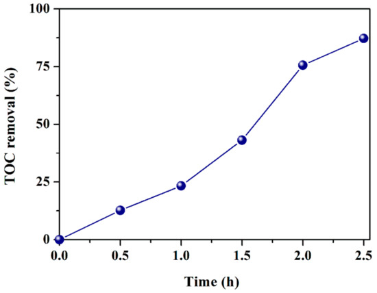 The mineralization of organic contaminants is pivotal in the wastewater treatment. To assess the mineralization of LEV, TOC values were recorded during the degradation of LEV (40 mg L−1, 200 mL) by 1.0CdS/Bi2MoO6 (200 mg). As depicted in Figure 5, 90.1% of TOC was removed after 2.5 h of reaction. These results indicate that 1.0CdS/Bi2MoO6 could effectively decompose and mineralize the LEV antibiotic.