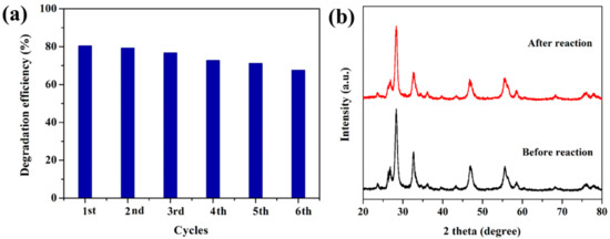 (a) Recycling tests of 1.0CdS/Bi2MoO6 for LEV degradation; (b) XRD patterns of 1.0CdS/Bi2MoO6 before and after six cycles.