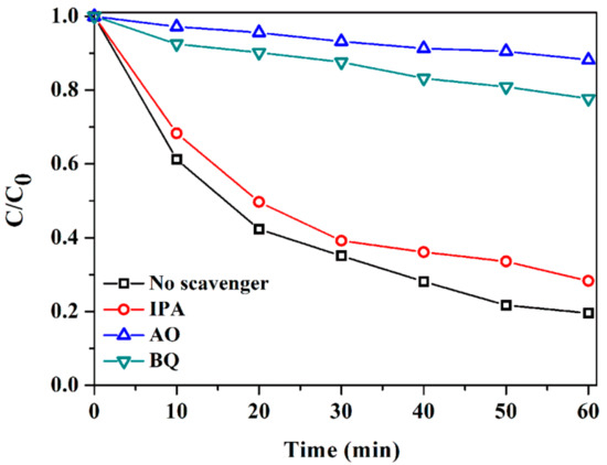 A batch of experiments was conducted to analyze the photocatalytic reaction mechanism accounting for the degradation of the LEV antibiotic under visible light through adding various scavengers (Figure 7). The LEV degradation rate showed no obvious decline when IPA (scavenger of •OH) was introduced, indicating that •OH did not play a pivotal role. By contrast, the LEV degradation rate was substantially suppressed by BQ (quencher of O2•−) or AO (quencher of h+), reflecting that O2•− and h+ could be the dominant active species responsible for the LEV degradation over 1.0CdS/Bi2MoO6.