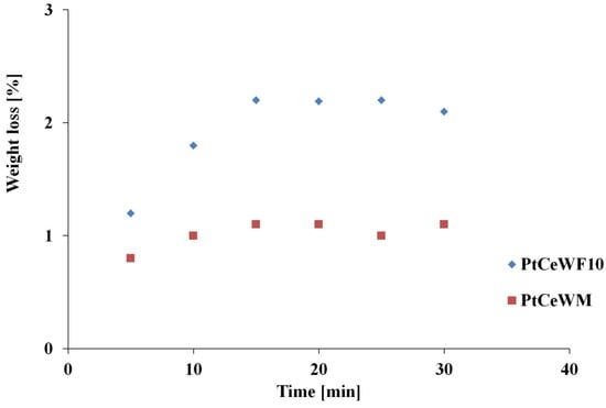 Washcoat weight losses during the ultrasonic adherence tests. PtCeWF10—Pt/ceria/washcoat/foam 10_10/12; PtCeWM—Pt/ceria/washcoat/monolith.