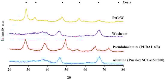The XRD patterns of the washcoat allowed for confirming the transformation of pseudoboehmite in ɣ-alumina, after the calcination of the powder washcoat at 723 K []. In fact, the diagnostic peak at 2θ 28.2 of pseudoboehmite disappeared in the diffractogram of the powder washcoat []. Moreover, the diffractogram of the catalytic formulation (PtCeW) allowed for checking the transformation of cerium nitrate in ceria, with the appearance of the characteristic cubic fluorite structure []. While, on the contrary, no peaks attributable to the platinum species were detected, probably due to the low loading (Figure 2).