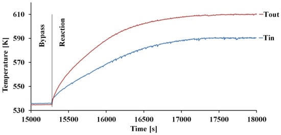 The experiments were carried out in two steps, as follows: In the first (by-pass), the system was brought to the thermal equilibrium by feeding a mixture of vaporized water and nitrogen, by keeping on the catalytic bed a temperature of 533 K. For step two (reaction), the nitrogen was replaced by carbon monoxide, without changing the total flow rate. The temperatures on the catalytic bed were measured with several thermocouples, positioned at the center of the bed along the axial direction (Figure 4), while a sampling of the stream composition was made at an axial position of z/L ≈ 0.1 (by considering the catalyst length equal to L), by means of a stainless-steel capillary connected to a mass spectrometer.