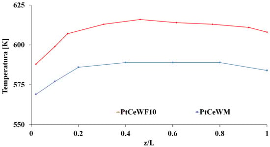 In Figure 6, it can be observed that both of the samples showed a more pronounced increase of the temperature in the first zone of the catalytic bed (up to z/L = 0.2) and reached the temperature of about 583 K and about 603 K for PtCeWM and PtCeWF10, respectively. From z/L = 0.2 on, two different behaviors can be observed—PtCeWM showed an approximate isothermal profile, and PtCeWF10 showed a further increase in temperature, up to a value of about 613 K, followed by a slight decrease up to the end of the catalytic bed.