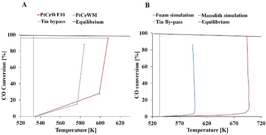 Additionally, Figure 7A shows two different patterns concerning the evolution of CO conversion versus temperature. Particularly, both of the catalytic systems showed two main zones, as already discussed for the temperature profile along the catalytic bed, as follows: in the first zone, the temperature increased rapidly causing only a little increase in the CO conversion (PtCeWM showed 577 K and 15% of CO conversion, while PtCeWF10 showed 599 K and 28% of CO conversion); in the second zone, there was a slight increase in the temperature values, together with a marked increase in the CO conversion. Therefore, by considering that the second zone covered almost the 90% of the total length of the catalytic bed, it can be seen that the PtCeWM and PtCeWF10 structured systems allowed for better exploiting the catalyst bed, compared to a more classic packed bed, because the majority of the catalyst works at the higher temperatures, guaranteeing the higher kinetics for the system and avoiding the making of hot-spots [], which are typical of these kind of reaction systems [].